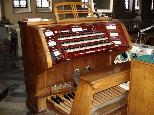 Urządzenia dodatkowe: automat pedałowy, 2 wolne kombinacje, crescendo, żaluzja manuału II, wyłącznik głosów językowych
